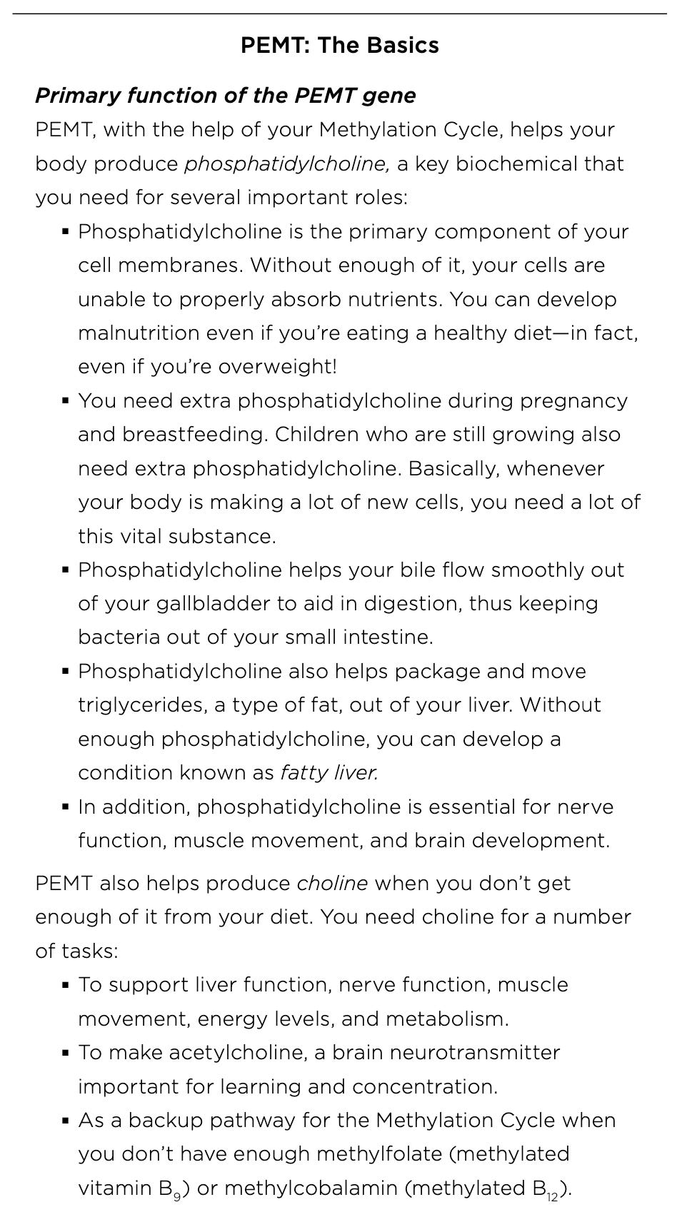 The PEMT gene controls your ability to produce phosphatidylcholine, a molecule critical for liver and gallbladder health. If you’re homozygous here, you may struggle with: